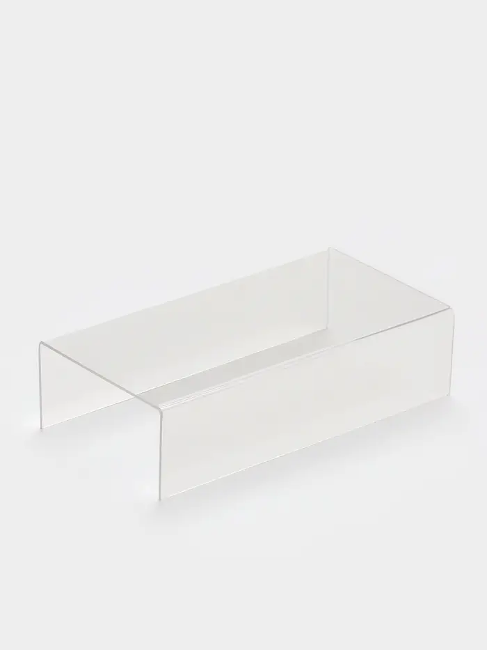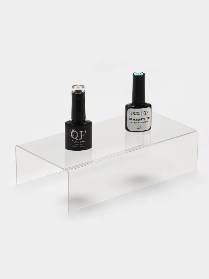 Одинарная подставка-ступенька торговой марки QF. Прямоугольная конструкция из прозрачного оргстекла толщиной 2 мм предназначена для подиумной выкладки и зонирования товаров на витринах в магазинах косметики, аксессуаров или электроники.