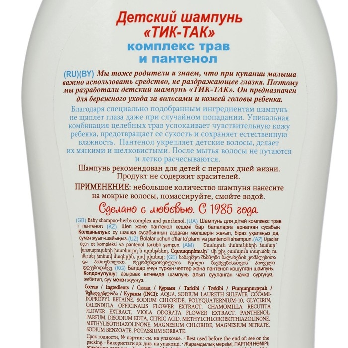 Шампунь, который не щиплет глазки, — «Тик-так» с комплексом трав и пантенолом от российского производителя АО «Свобода». Детский продукт, предназначен для малышей с рождения. Он бережно ухаживает за волосами, делая их мягкими и шелковистыми. Благодаря шампуню они расчесываются без спутывания. Продукт без красителей нежно успокаивает чувствительную кожу, предупреждает ее сухость. Флакона объемом 350 мл хватит надолго.