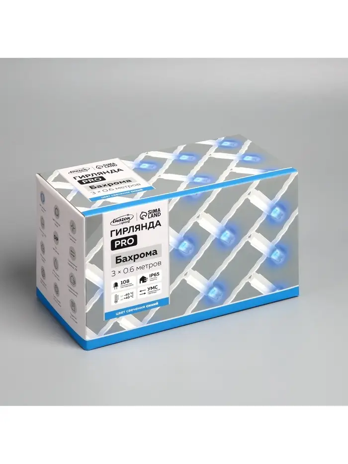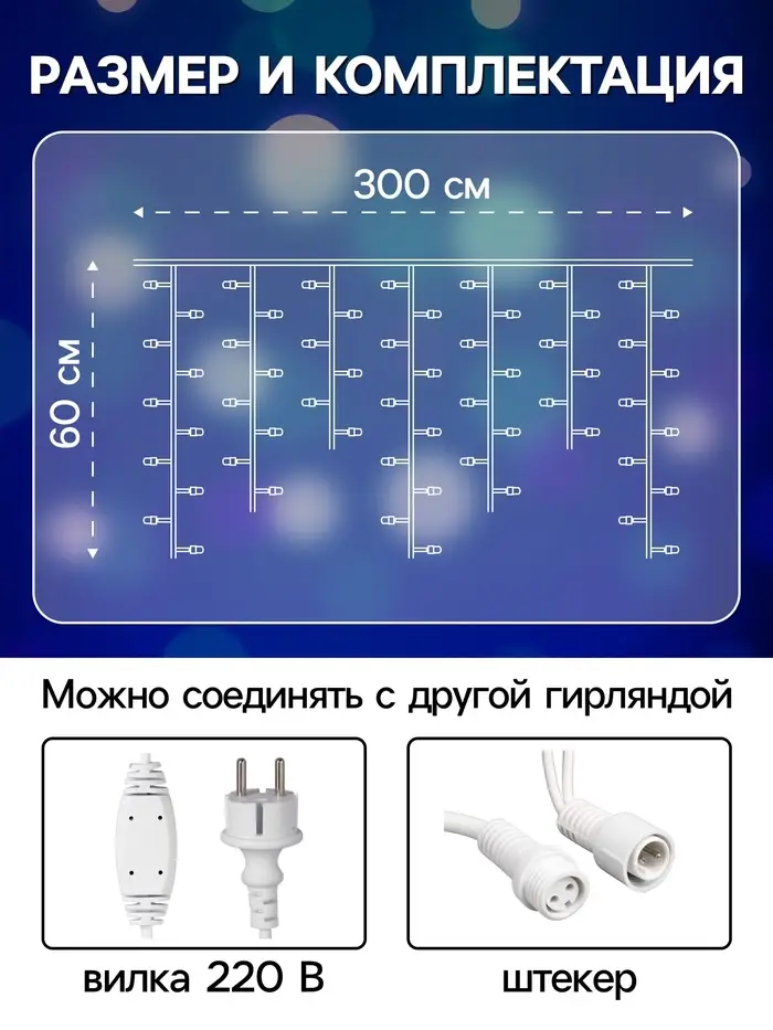 Гирлянда «Бахрома» 3×0.6 м, IP65, УМС, белая нить каучук, 108 LED, свечение синее, 220 В