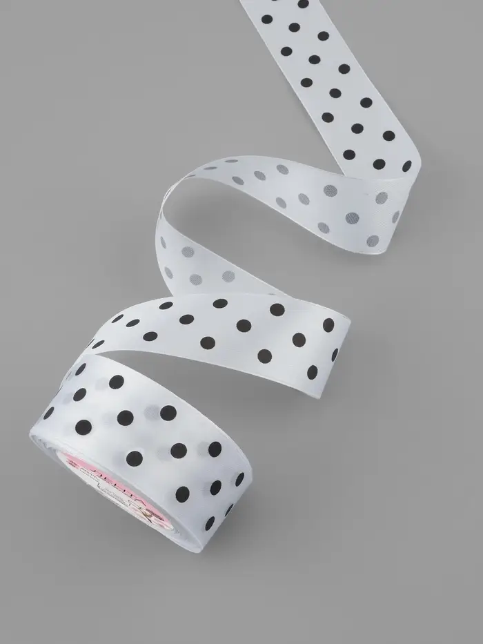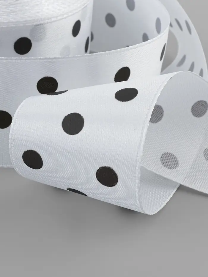 Лента подходит для упаковки крупных подарков, украшения текстиля, оформления интерьера и праздничных мероприятий. Она востребована в рукоделии, свадебном и флористическом декоре. Благодаря контрастному узору «горошек» оформление приобретает лёгкость и выразительность.