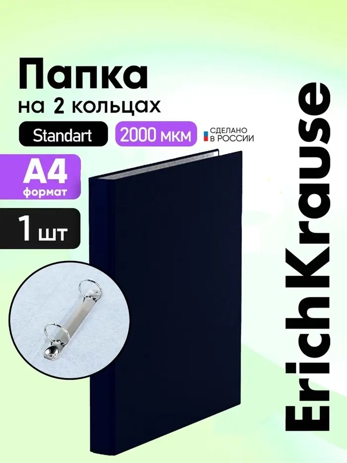 Папка на 2 кольцах, А4, ErichKrause Standart, 35 мм, 2000 мкм, ламинированная, твердая обложка, черная