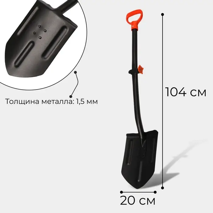 Складная автомобильная лопата «Копанец-Авто», 104 см — это компактный и функциональный инструмент для автомобилистов. Лопата решает проблему хранения в багажнике, предоставляя при этом полноценную длину черенка для эффективной работы.