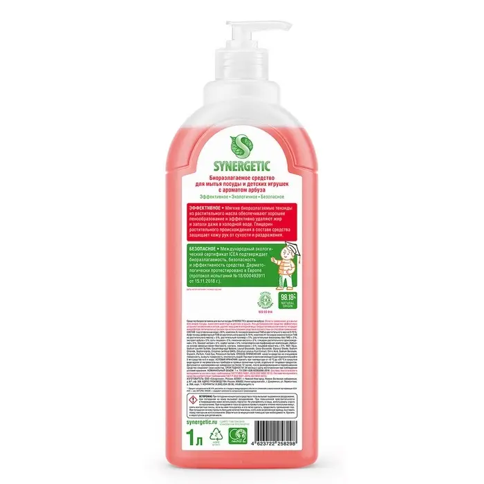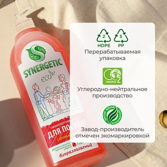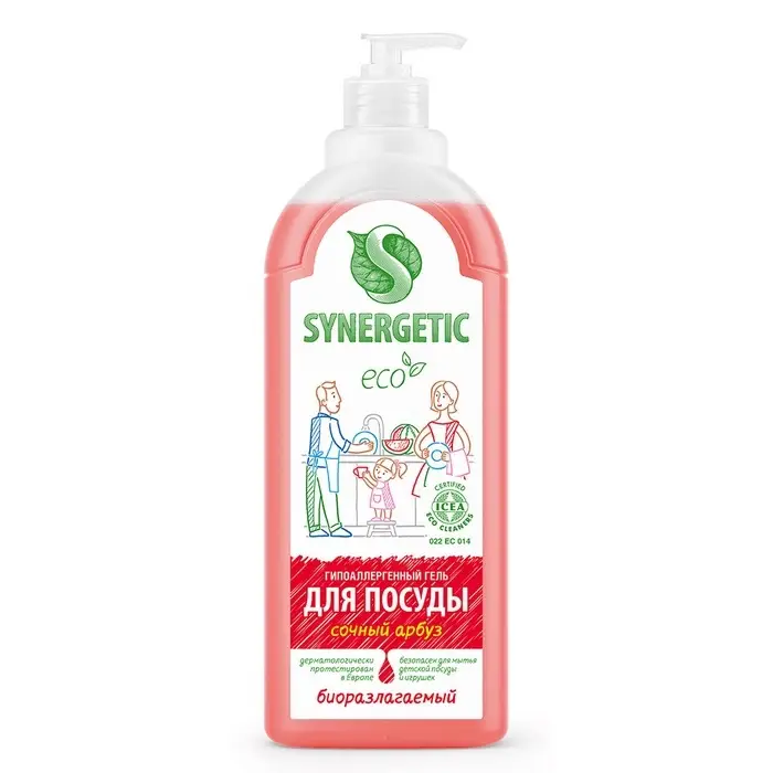 Средство для мытья посуды Synergetic, антибактериальный гель, биоразлагаемый, арбуз, 1 л