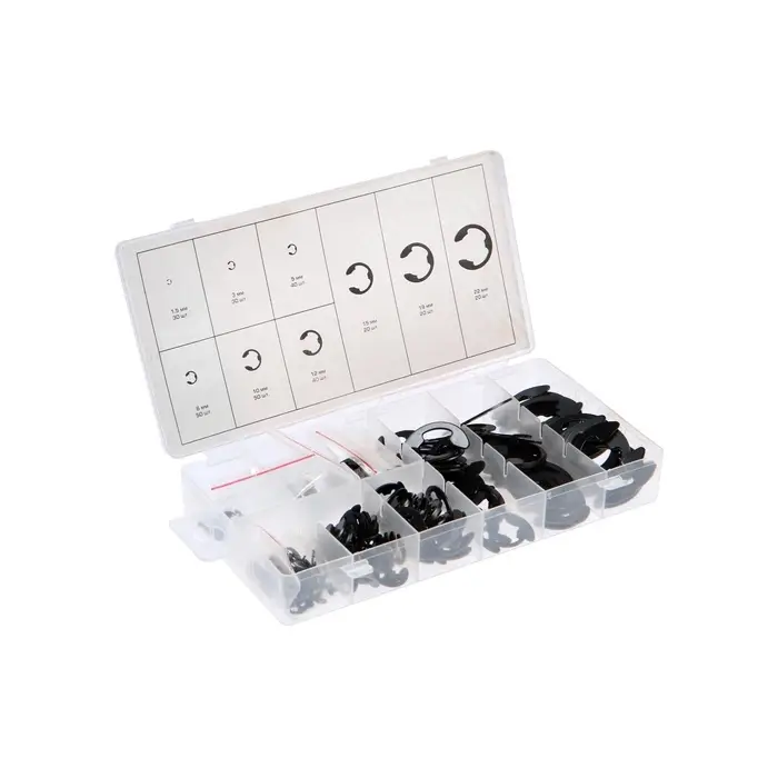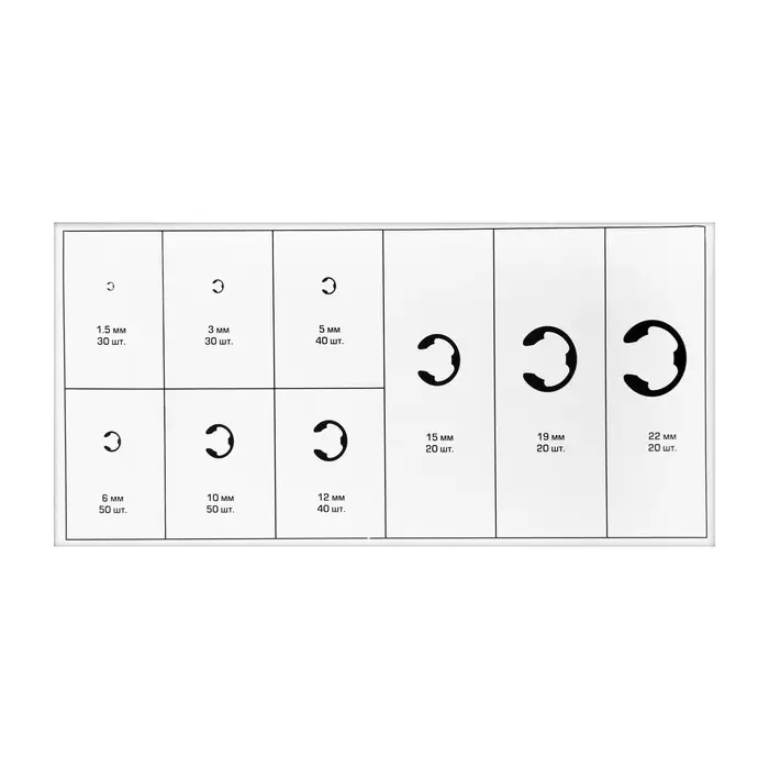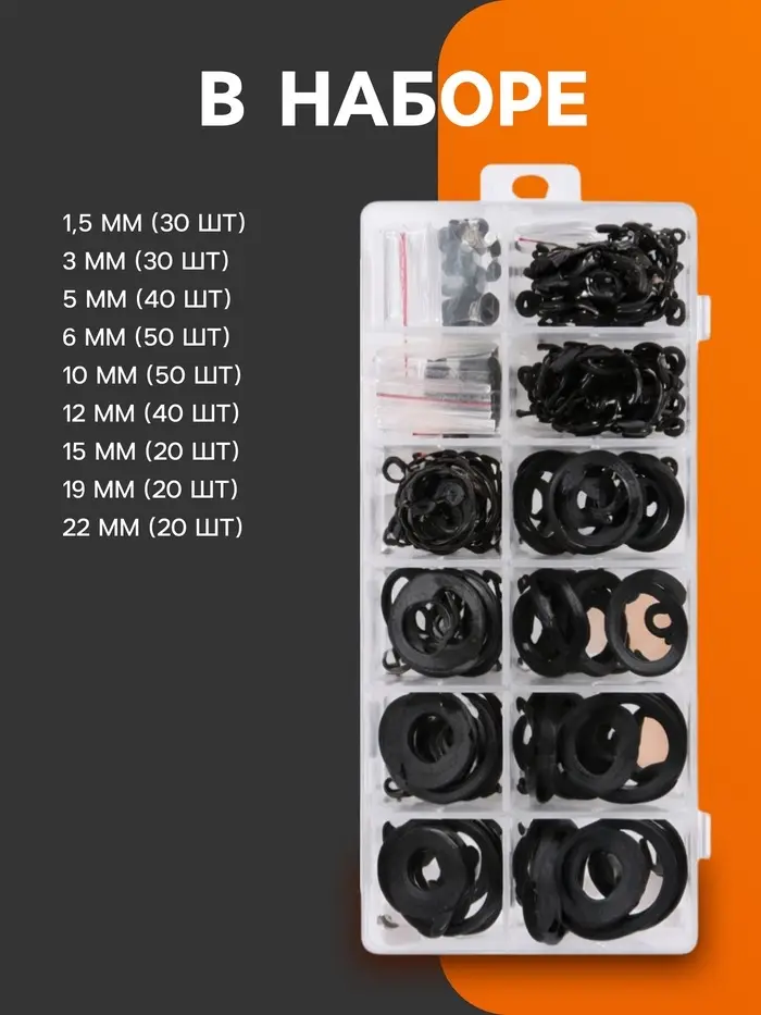 Преимущества набора: 300 стопорных колец одного комплекта заменяют множество отдельных упаковок, обеспечивая готовность к разным задачам в механике и ремонте. Универсальные размеры позволяют работать с валами и осями малого и среднего диаметра, делая набор практичным и удобным для мастера.