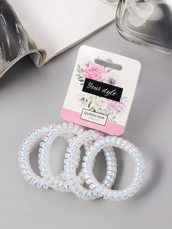- Набор из 4 штук в переливающемся белом цвете: Четыре одинаковые резинки в наборе решают проблему потерявшихся аксессуаров. Нежный перламутровый перелив сочетается с любой одеждой — от повседневного стиля до вечернего образа.