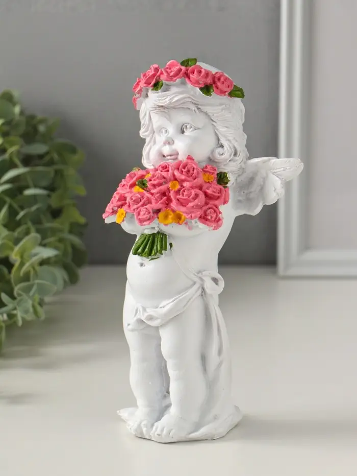 Эта белая фигура ангела с цветами станет изысканным акцентом в саду или тёплым подарком, наполненным смыслом. Её классический образ несёт ощущение спокойствия, нежности и светлой надежды.
