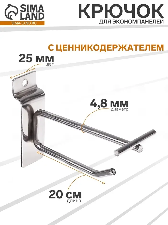 Универсальный металлический крючок с держателем для ценника длиной 20 см и толщиной 4,8 мм предназначен для экономпанелей с шагом перфорации 25 мм. Хромированное покрытие краской обеспечивает защиту от коррозии и придаёт изделию аккуратный серебристый оттенок. Одинарный дизайн крючка подходит для компактного и удобного размещения товаров.