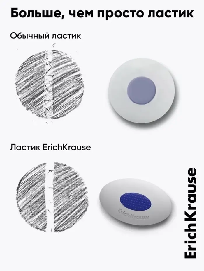Ластик средней жесткости оригинальной формы из современного и экологически чистого и гипоаллергенного материала термопластичной резины (TPR) с пониженным образованием крошек (Dust free) с эргономичным пластиковым держателем. Не содержит ПВХ. Размер 46 х 43 х 12 мм.