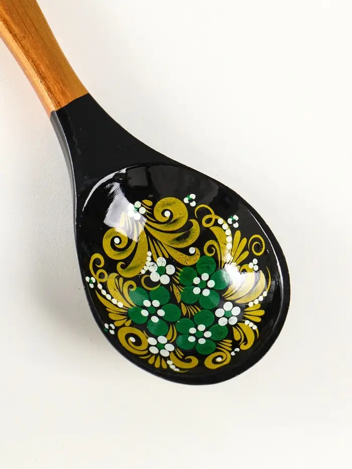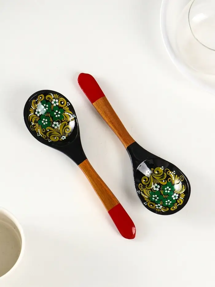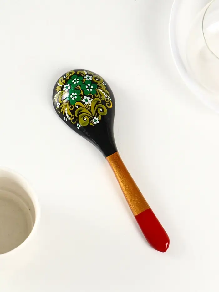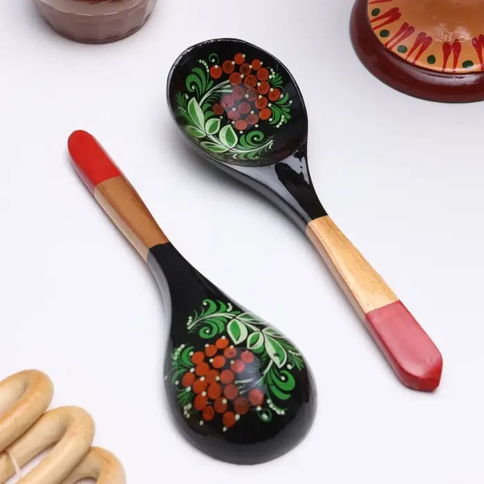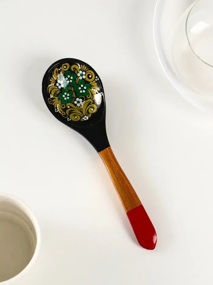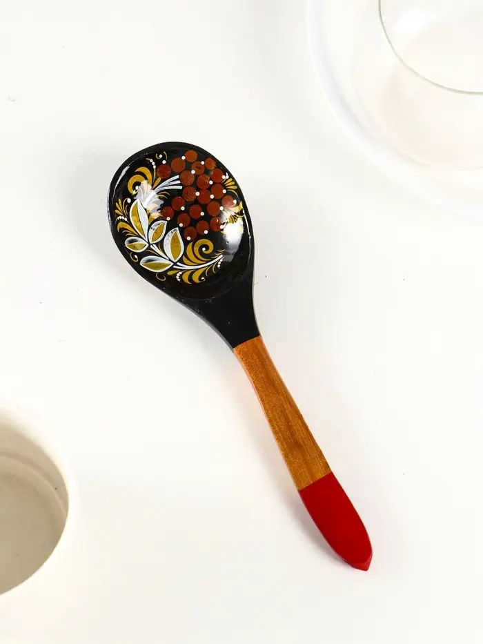 Изготовленная из берёзы, она не просто удобно лежит в руке, но и становится маленьким произведением искусства на вашем столе. Ручная хохломская роспись с её алыми узорами на чёрном фоне превращает обычный столовый прибор в выразительный акцент сервировки.