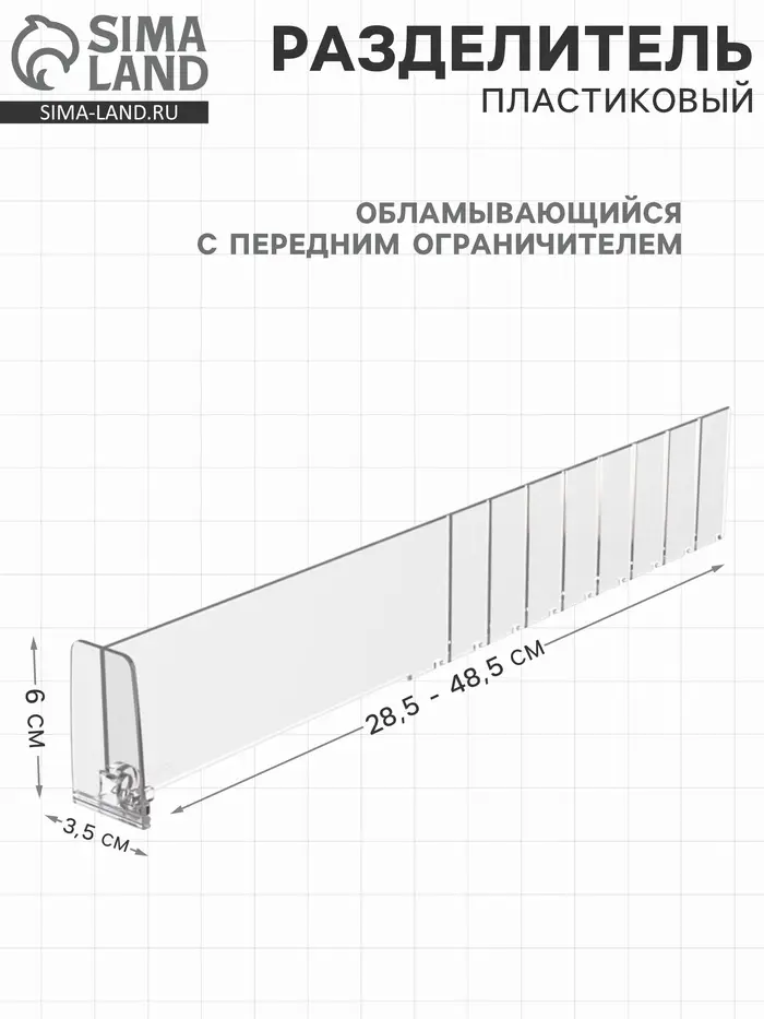 Пластиковый обламывающийся разделитель c передним ограничителем 60 мм, 285-485×20×60 мм