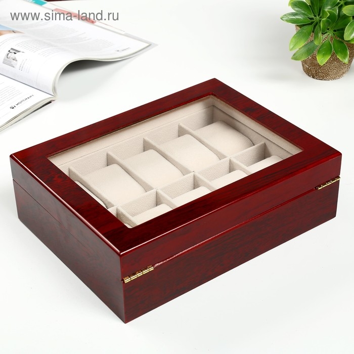 Шкатулка дерево под часы 10 отделений "Красно-коричневая" лак 8х26х20 см
