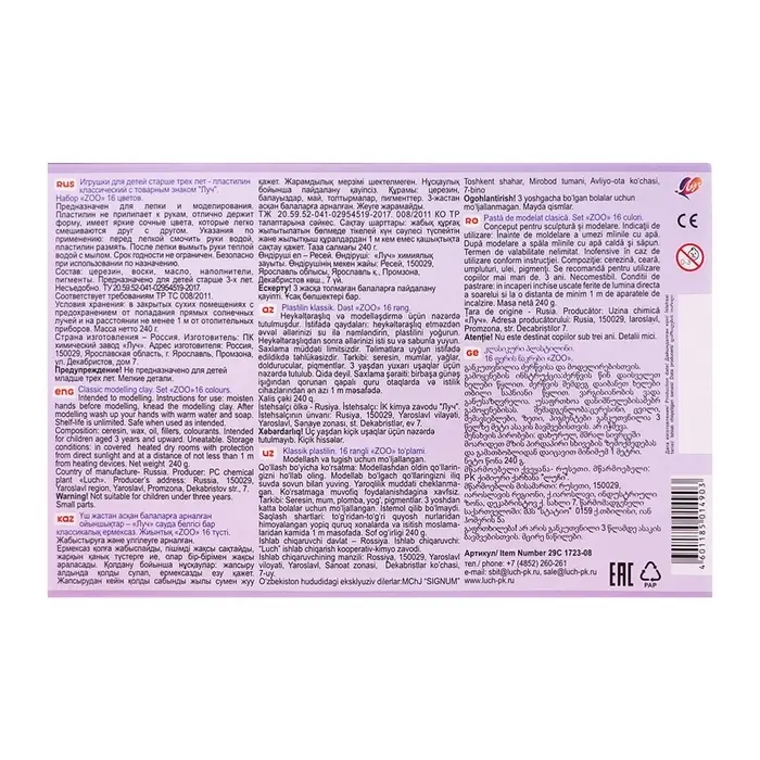 Пластилин «Луч. ZOO», 16 цветов, 240 г