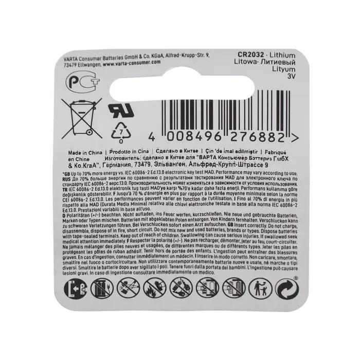 Батарейка литиевая Varta, CR2032-1BL, 3 В, блистер, 1 шт.