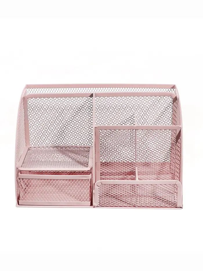 Подставка для канцелярских мелочей 7 отделений, сетка металл, розовая