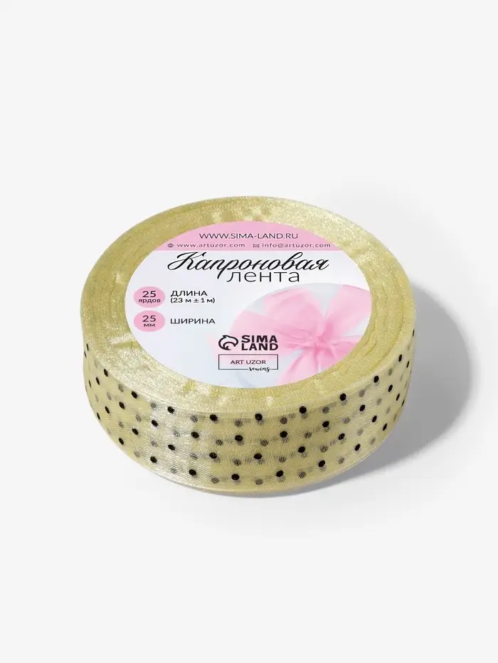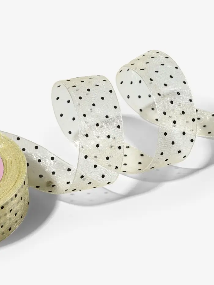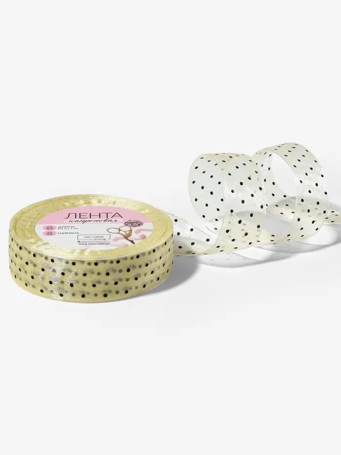 Лента с кружочками подойдёт для декора свадебных аксессуаров, скрапбукинга и поделок. Её легко завязать бантом на коробке или вплести в цветочную композицию. Нейлон не боится влаги — можно украшать букеты или открытки без риска испортить материал.