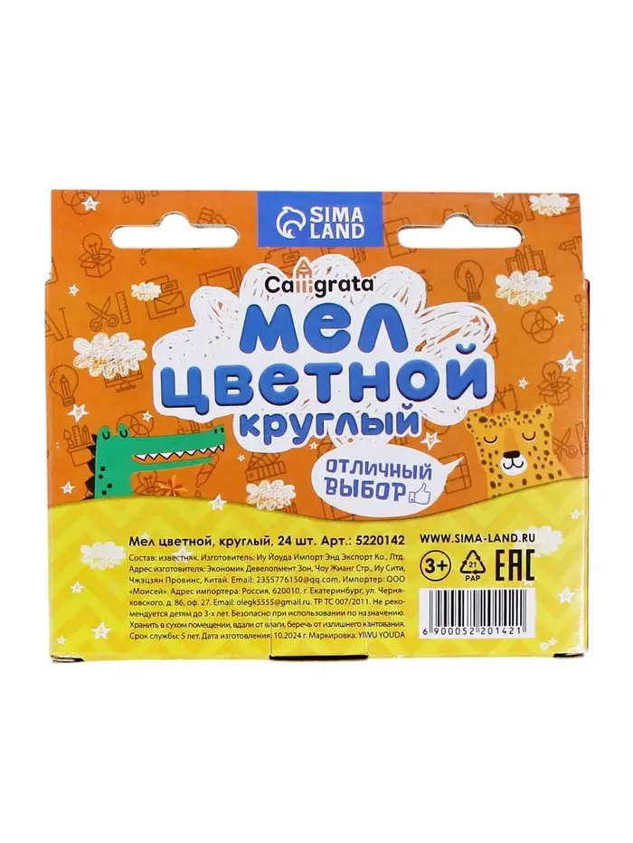 Мел школьный цветной, 6 цветов, круглый беспыльный, 24 штуки, в картонной коробке