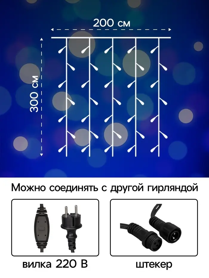 Гирлянда «Бахрома» 3×0.6 м, IP44, УМС, тёмная нить, 160 LED, свечение бело-синее, мигание, 220 В