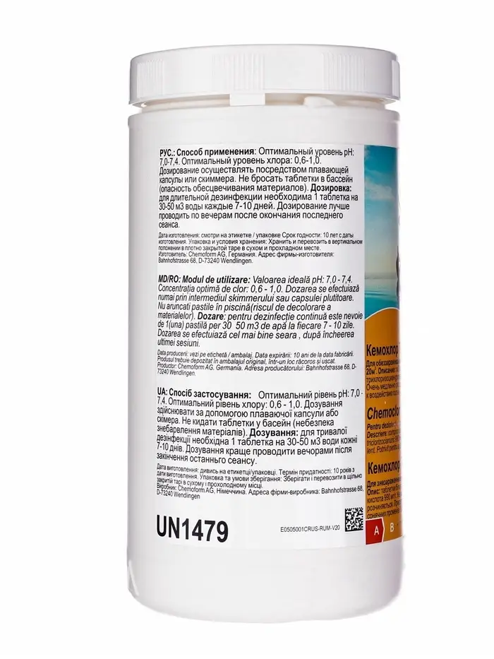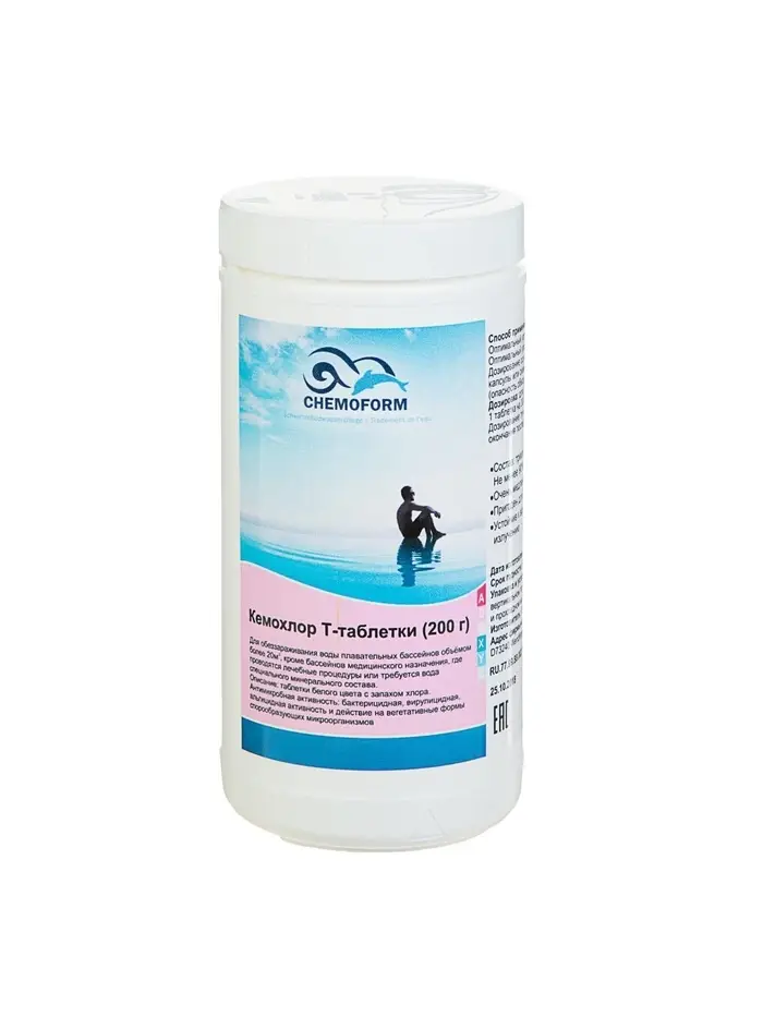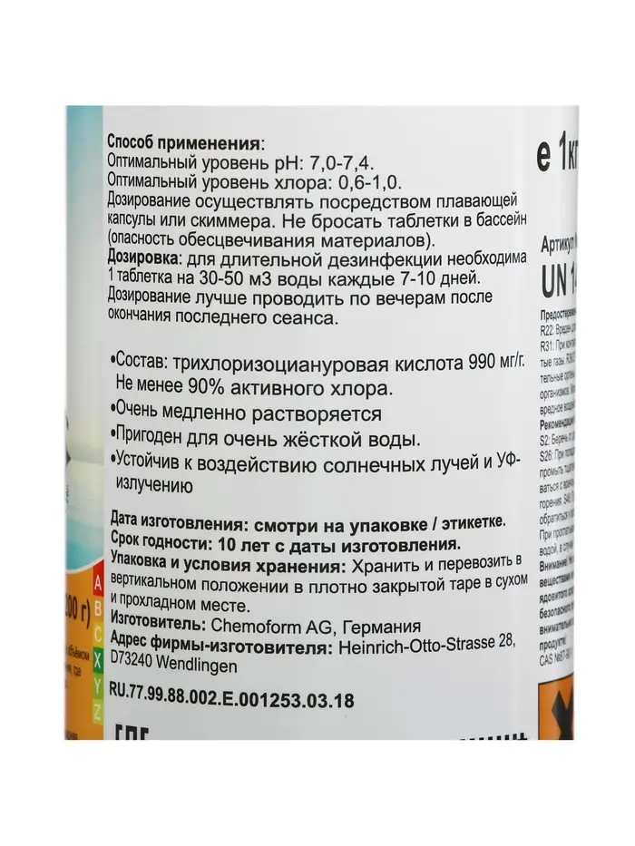 Применение: Для длительной дезинфекции необходимо каждые 8-14 дней по одной таблетке на 30-50м3 воды. Ударную обработку застоявшейся воды следует проводить посредством Кемохлор-экспресс таблеток или гранулированного хлора T-65. Дозирование следует осуществлять посредством плавающей капсулы или скиммера. Не кидать таблетки в бассейн (опасность обесцвечивания материалов).