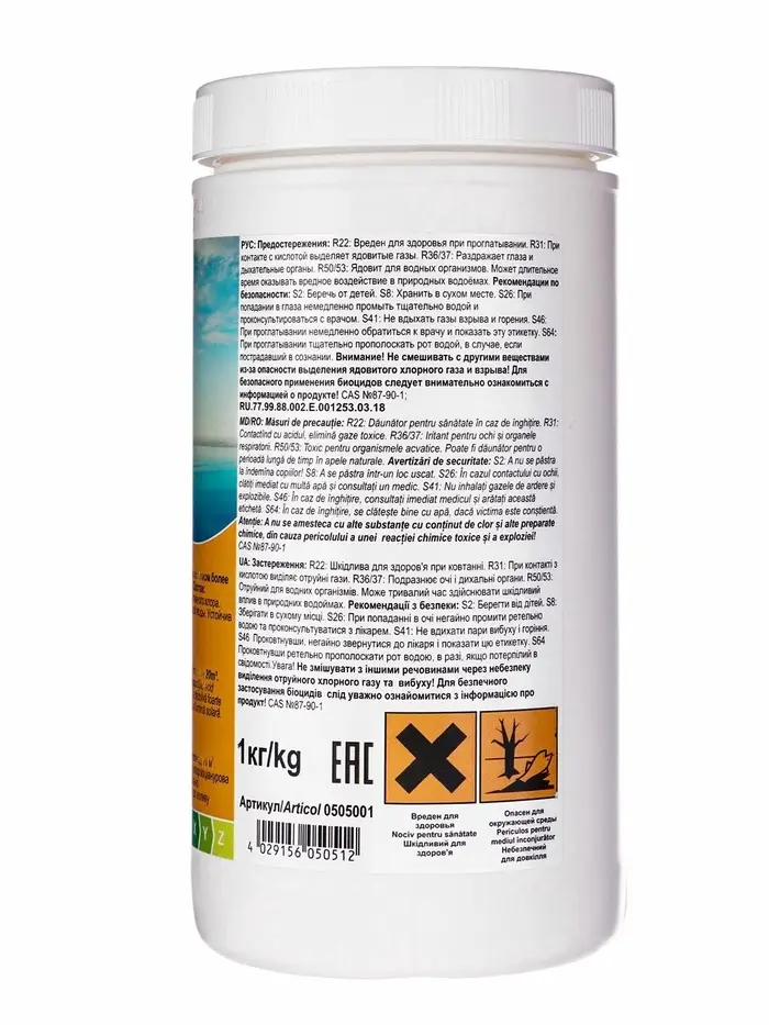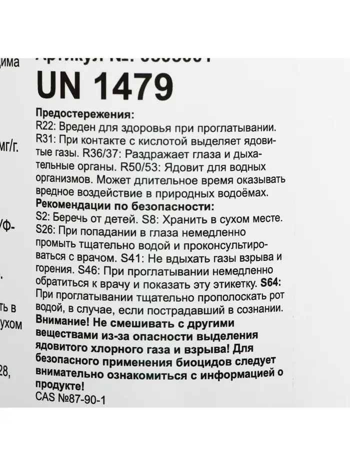 Внимание: Не смешивать с другими химикатами! При смеси с другими хлорными продуктами опасность выделения ядовитых газов и взрыва!
