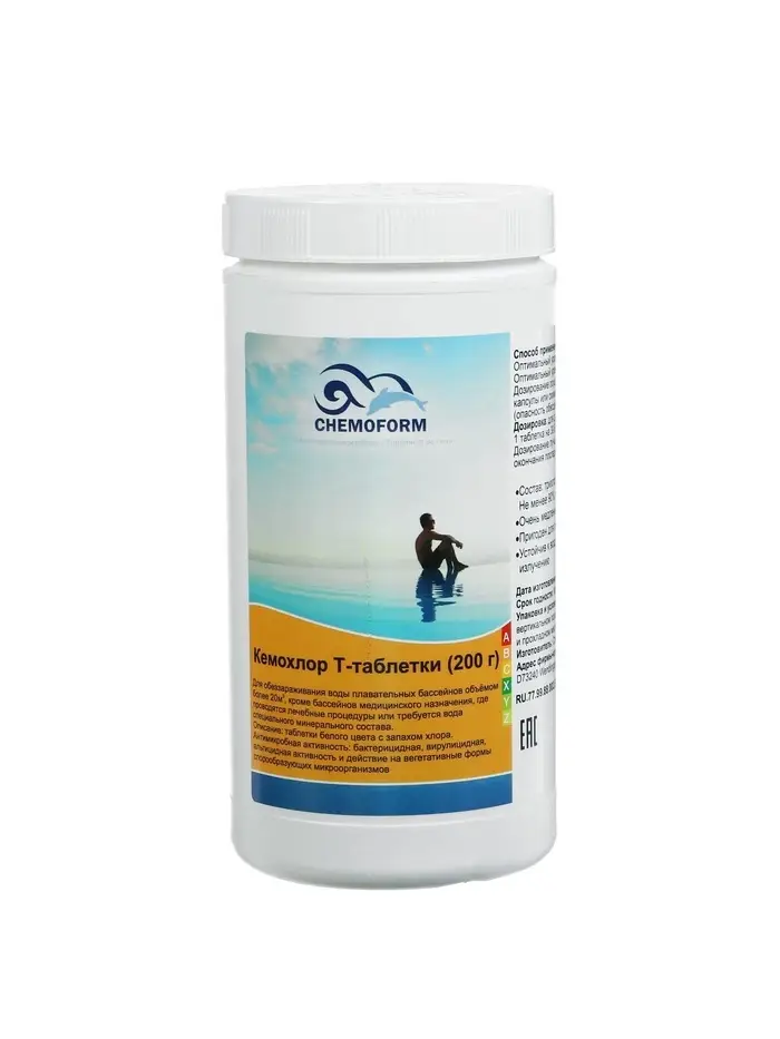 Хлорные таблетки с использованием трихлоризоциануровой кислоты, более 90% активного хлора для длительной дезинфекции воды в бассейне объёмом более 20 м3.