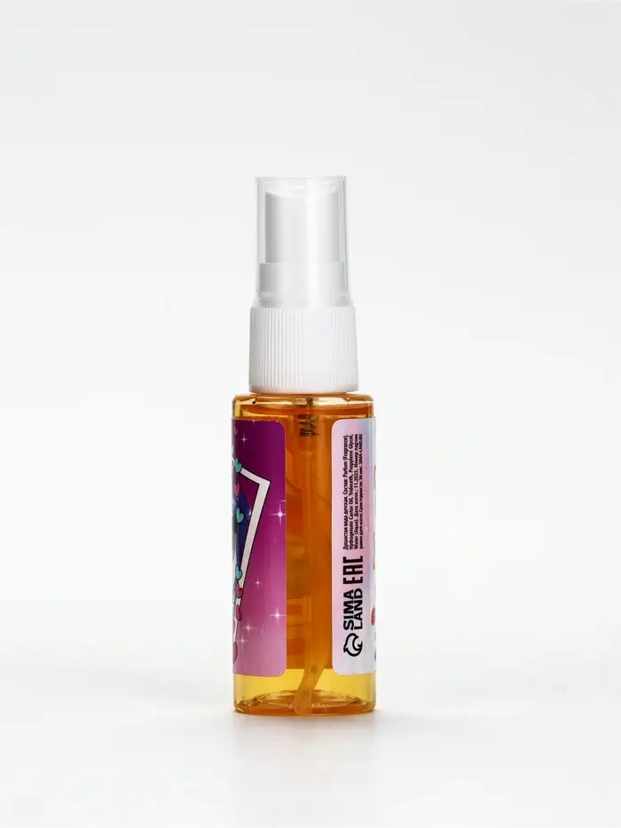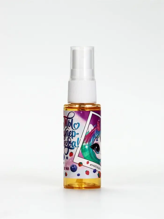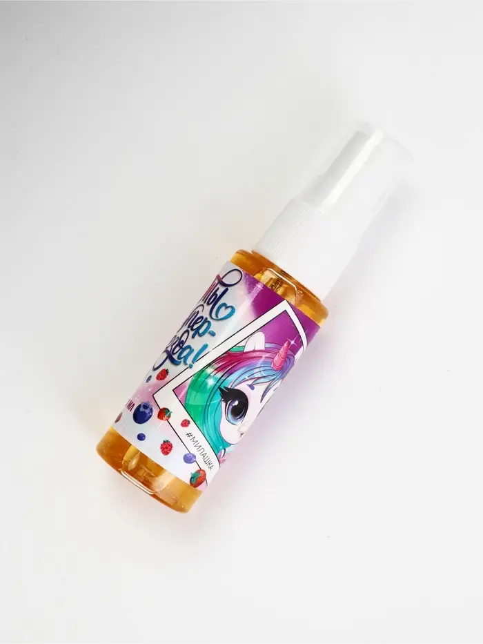 Флакон оснащён удобным спреем-дозатором и изготовлен из пластика. Он не разобьётся, если ребёнок вдруг его уронит. Объём флакона — 30 мл.
