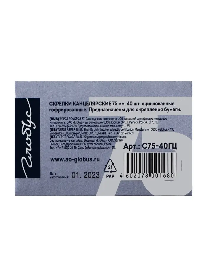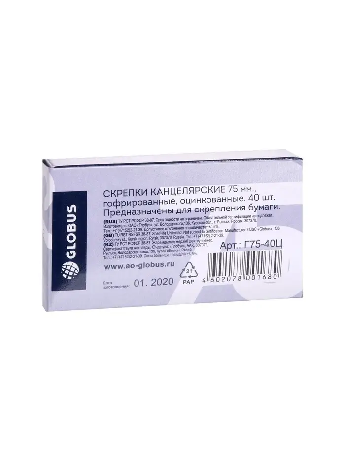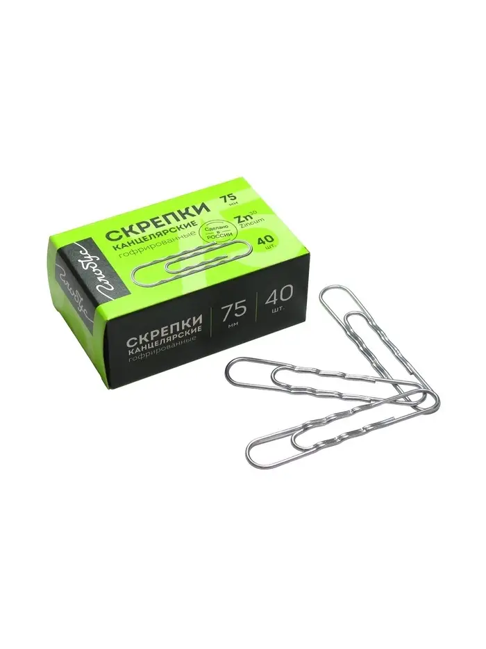 Скрепки канцелярские GLOBUS, 75 мм, 40 шт., оцинкованные, гофрированные