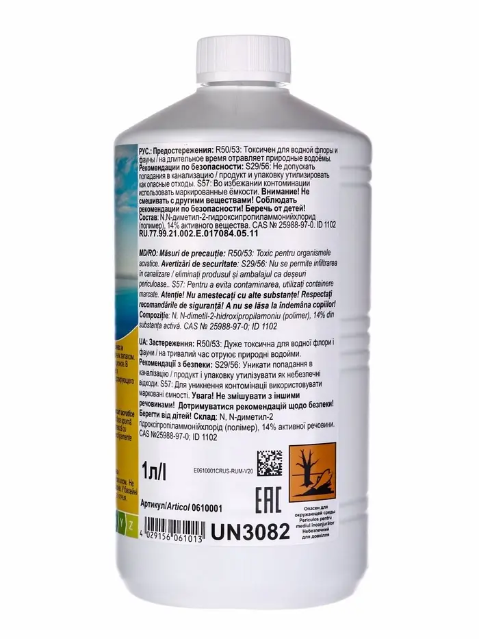 Дозировка: Для первичной обработки использовать 100 мл препарата на 10 кубометров воды. Далее каждые 14 дней применять 100 мл на 10 кубометров воды. Для проведения шоковой терапии использовать 600 мл на 10 кубометров воды. Активное купание, высокая температура и обильные осадки способствуют росту водорослей и могут потребовать применения более высоких доз.