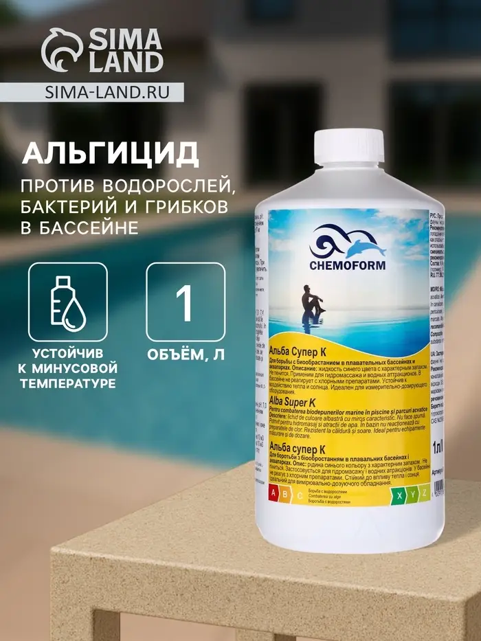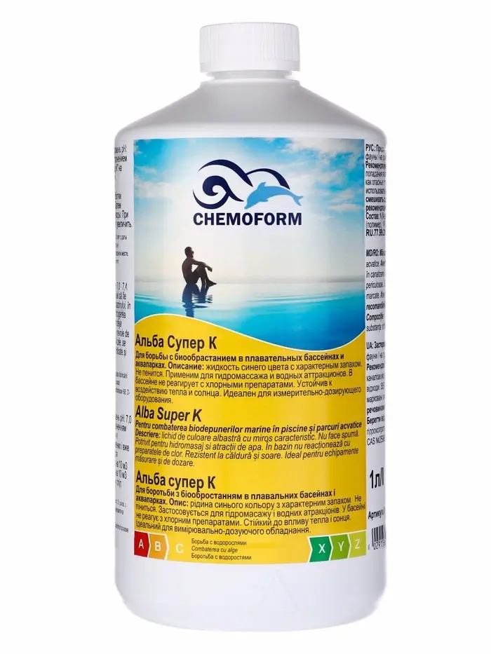 Чтобы вода в бассейне оставалась чистой и прозрачной, она нуждается в уходе. Chemoform Альба супер К – это высококонцентрированная жидкость-альгицид, которая предотвращает появление и рост водорослей на стенках бассейна. Добавление альгицида не может заменить эффект от применения дезинфицирующего средства, но может сократить его расход.