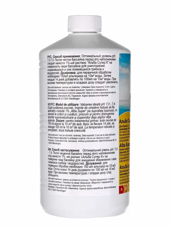 Альгицид Альба Супер К, против водорослей, бактерий и грибков в бассейне, 1 л