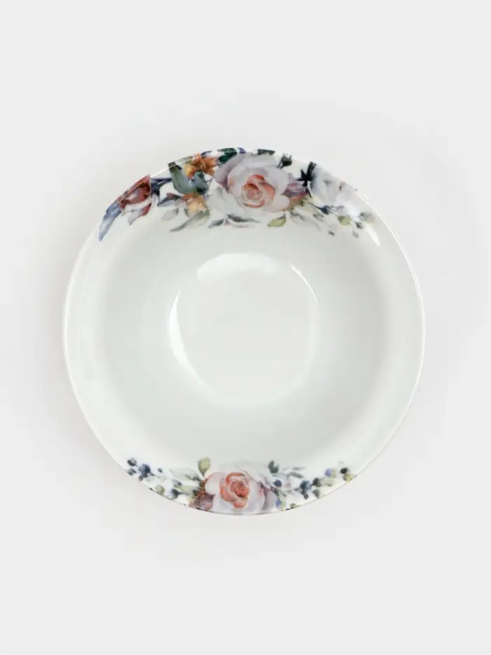 Такую тарелку выбирают, когда хочется, чтобы даже простая подача выглядела аккуратно и с настроением. Цветочный декор освежает сервировку, но не делает её слишком пёстрой, поэтому посуда остаётся уместной каждый день. Если нужна глубокая тарелка из фарфора с рисунком для дома, горячих блюд и уютной повседневной подачи, этот вариант станет понятным и удачным решением.