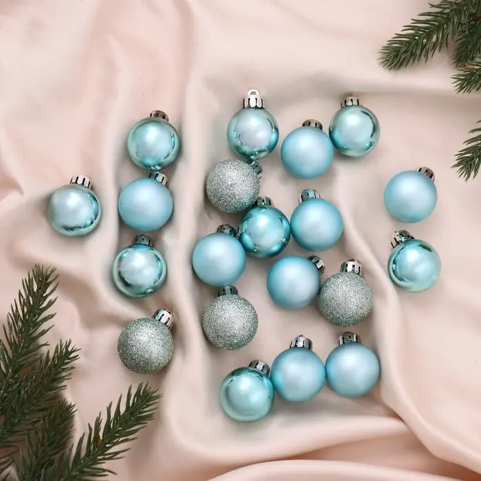 Набор из 20 небольших зелёных шаров диаметром 3 см выполнен в стиле шебби-шик и станет изящным дополнением к новогоднему оформлению. Однотонные пластиковые украшения создают спокойную и гармоничную атмосферу, легко сочетаясь с другими элементами декора.