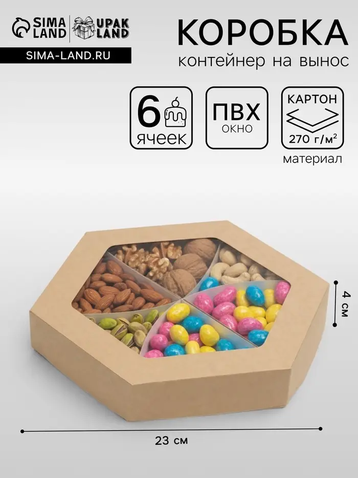Коробка - менажница крафт, с окном, 6 ячеек, 23×4 см
