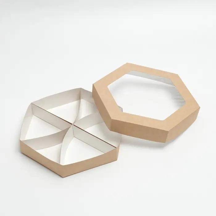 - Прозрачное окно в крышке: Верхняя часть закрыта прозрачной плёнкой. Содержимое видно без вскрытия упаковки. Это удобно для презентации товара и создаёт аппетитный вид. Крышка снимается, превращая коробку в сервировочное блюдо.