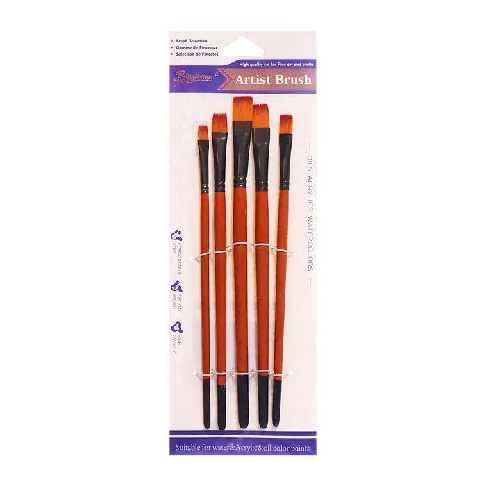 Этот набор плоских кистей станет надежным помощником на уроках рисования и в домашнем творчестве. Пять синтетических кистей с красной деревянной ручкой охватывают все базовые задачи — от фоновых заливок до работы с деталями.