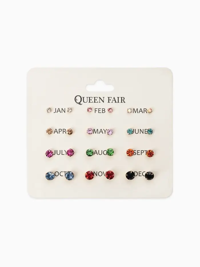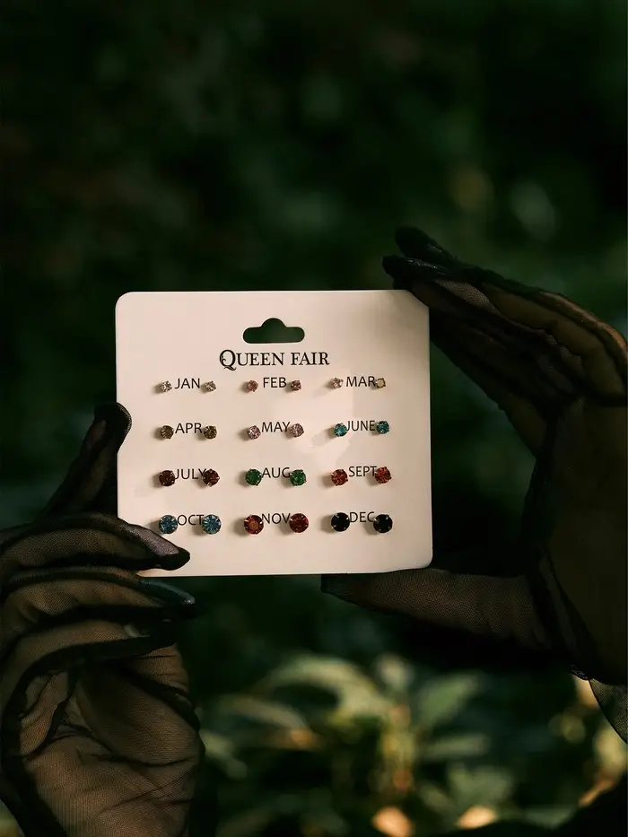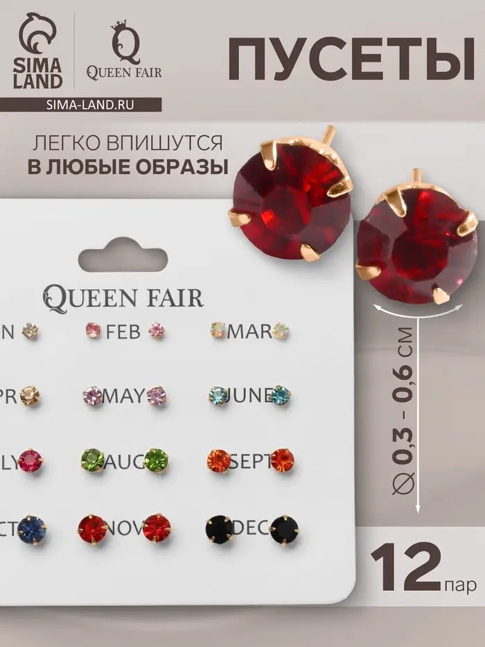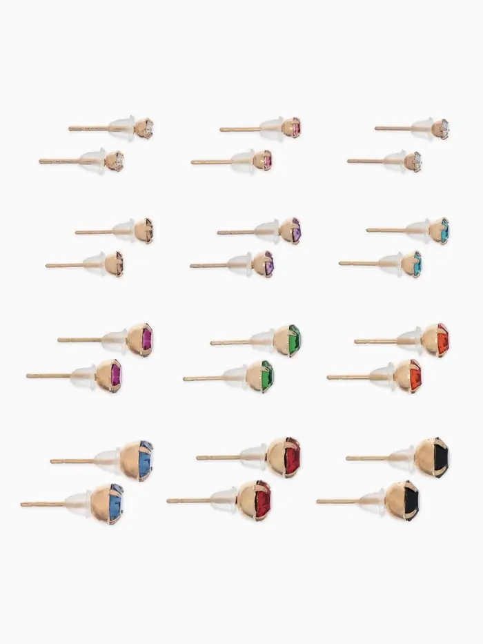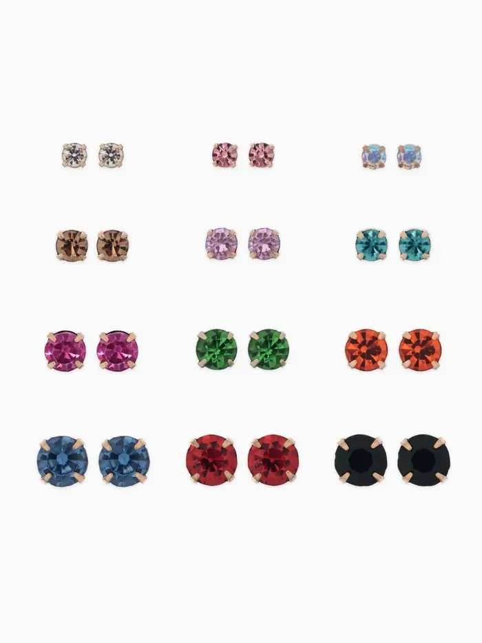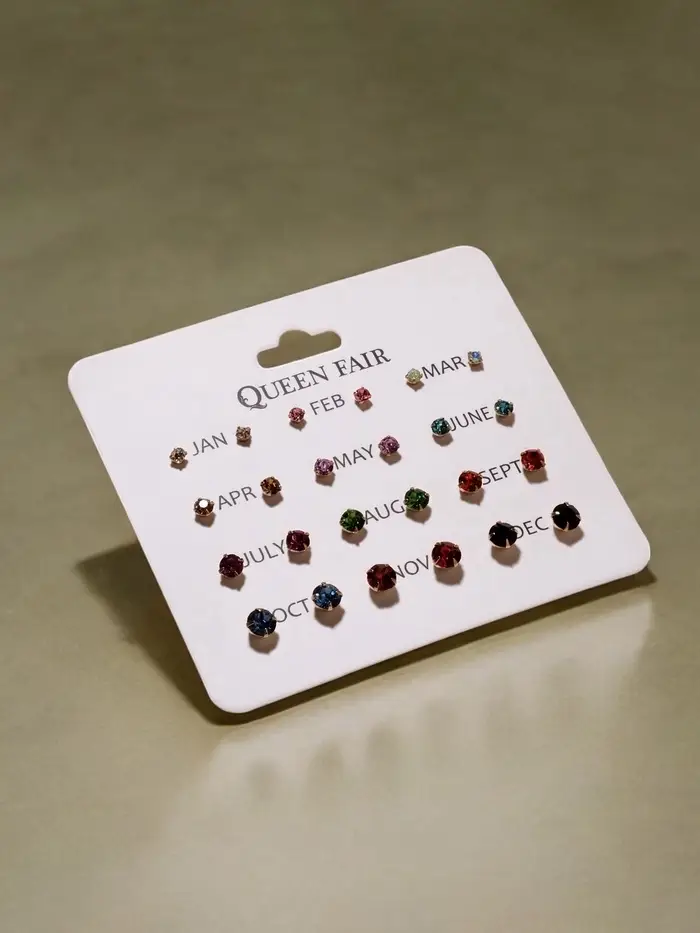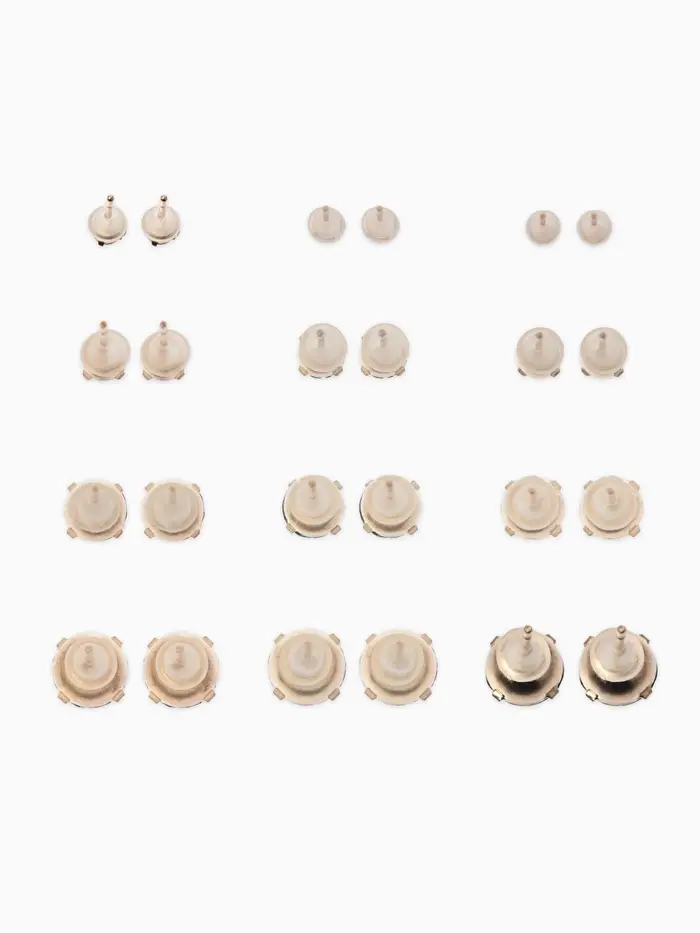 Набор из двенадцати пар миниатюрных разноцветных серёжек-гвоздиков с золотистым покрытием предлагает разнообразие стразовых акцентов диаметром от 3 до 6 мм. Компактные украшения длиной около 0,5 см подойдут для женщин и девочек, дополняя образ лёгким блеском и утончённостью.