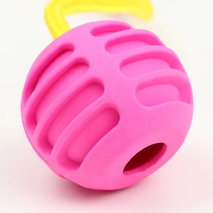 - Удобная веревка-рулетка: Текстильная веревка надежно вплавлена в центр шара, что исключает ее отрыв во время игры. С ней легко кидать мяч на большое расстояние, не пачкая руки, и приманивать собаку для следующей броска.