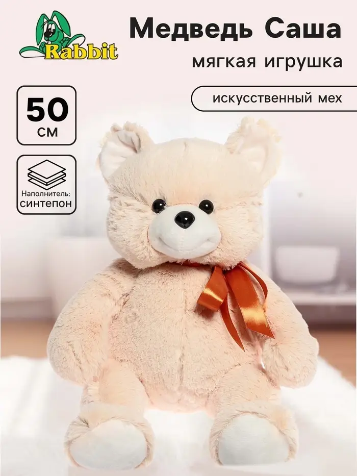 Мягкая игрушка «Медведь Саша» светлый — крупный плюшевый медвежонок высотой 50 см с нежным оттенком и аккуратным атласным бантом. Его спокойный, уютный образ ассоциируется с заботой, теплом и искренним вниманием.