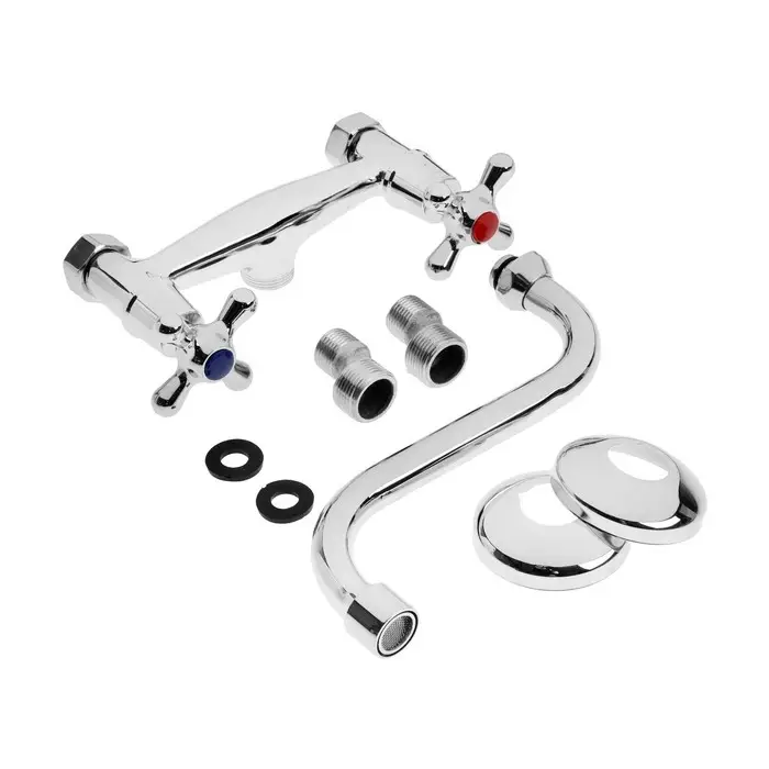 Настенный двухвентильный смеситель, хром — классическое решение для кухни с отдельно стоящей мойкой. S-образный поворотный излив, настенный монтаж и раздельное управление водой.