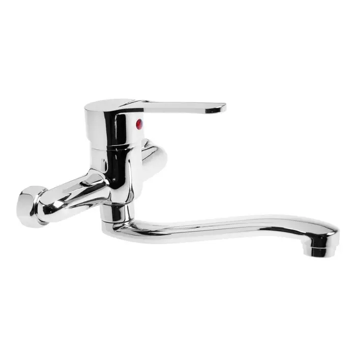 Настенный кухонный смеситель хром — рычажная модель для монтажа на стену над раковиной. Корпус из цинкового сплава с хромированным покрытием и изогнутым поворотным изливом.