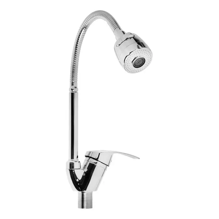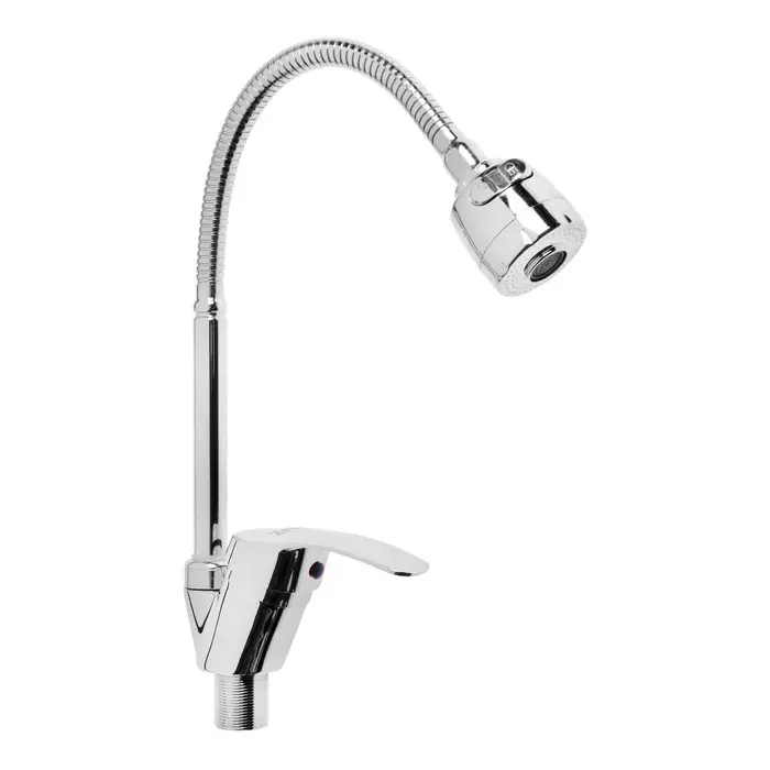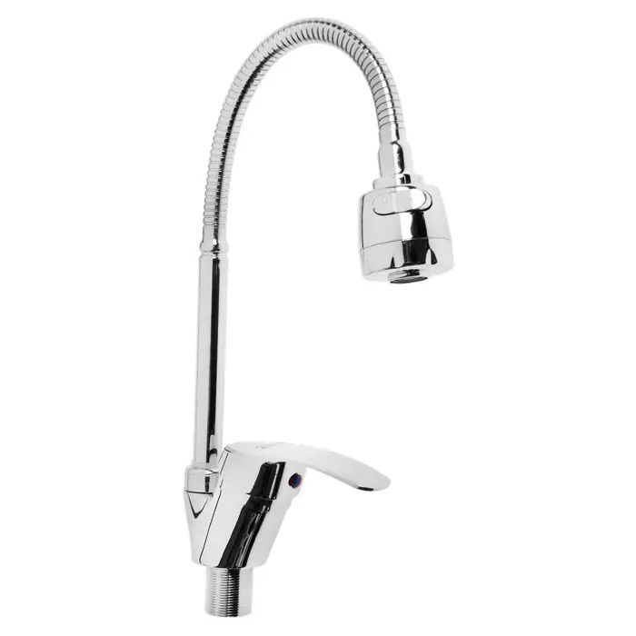 Однорычажный смеситель с длинным гибким изливом устанавливается на кухонную мойку или столешницу. В комплекте крепления на гайке, что упрощает монтаж.