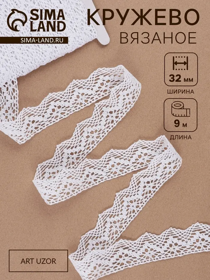 Кружево вязаное, 32 мм × 10 ± 1 м, цвет белый
