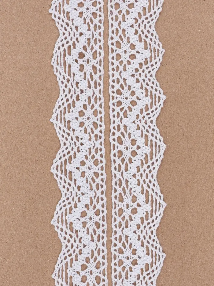 Вязаное кружево легко спутать с hand-made – рисунок у него сложный и выразительный. Узоры, созданные из переплетения множества нитей, принимают нужную форму и красиво смотрятся на любом изделии. Вязаное кружево — отличный вариант для декора одежды и домашнего текстиля. А также если хотите дополнить аксессуар деталью, будто связанной крючком, такой вариант отлично подойдёт.