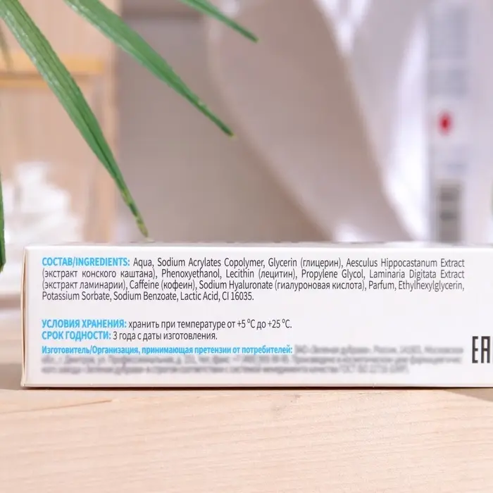 Состав: aqua, sodium acrylates copolymer, glicerin, aesculus hippocastanum extract (экстракт конского каштана), phenoxyethanol, lecithin, propylene glycol, laminaria digidata extract (экстракт ламинарии), caffeine (кофеин), sodium hyaluronate (гиалуроновая кислота), parfum, ethylhexylglycerin, potassium sorbate, sodium benzoate, lactic acid, Cl 16035