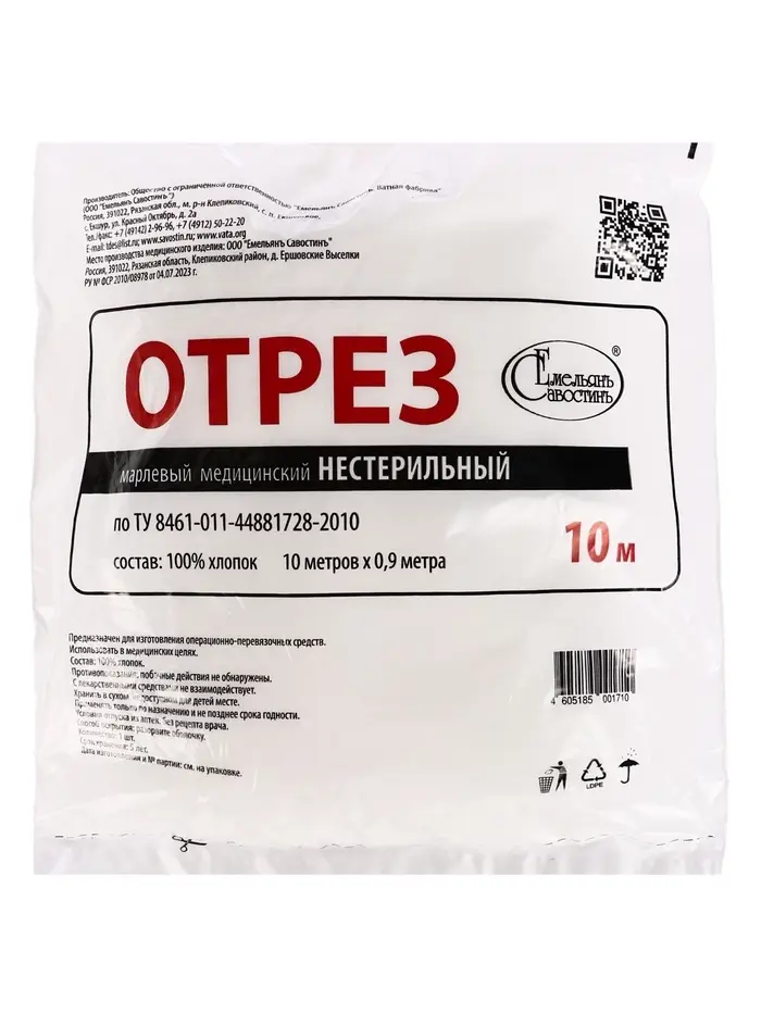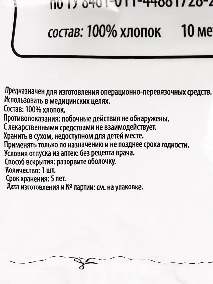 Размер 0,9 × 10 метров делает данный отрез экономичным и удобным вариантом для длительного использования. Марлю можно легко разрезать на фрагменты нужного размера, создавая перевязочные салфетки, тампоны, компрессы или другие изделия в зависимости от потребностей.