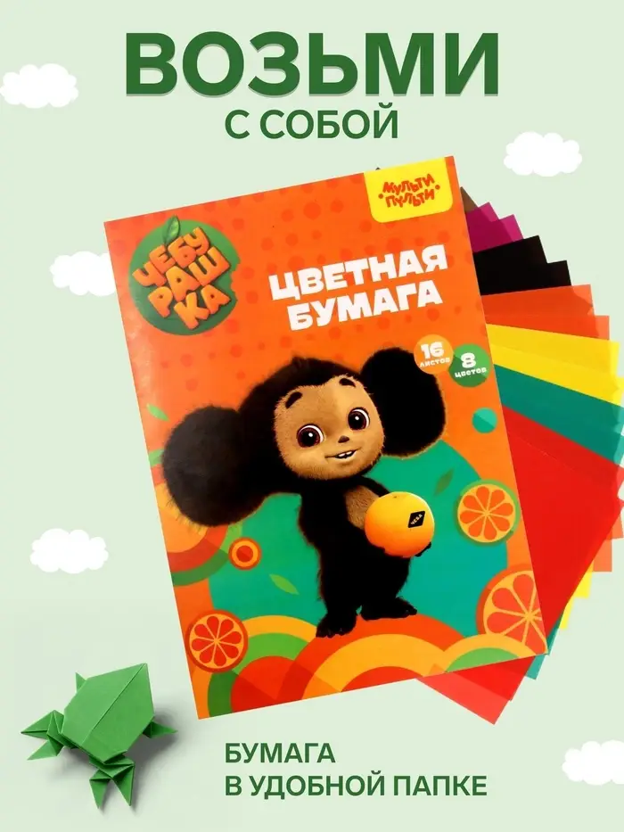 Бумага цветная офсетная А4, 16 листов, 8 цветов «Мульти-Пульти. Чебурашка», в папке, плотность 65 г/м²