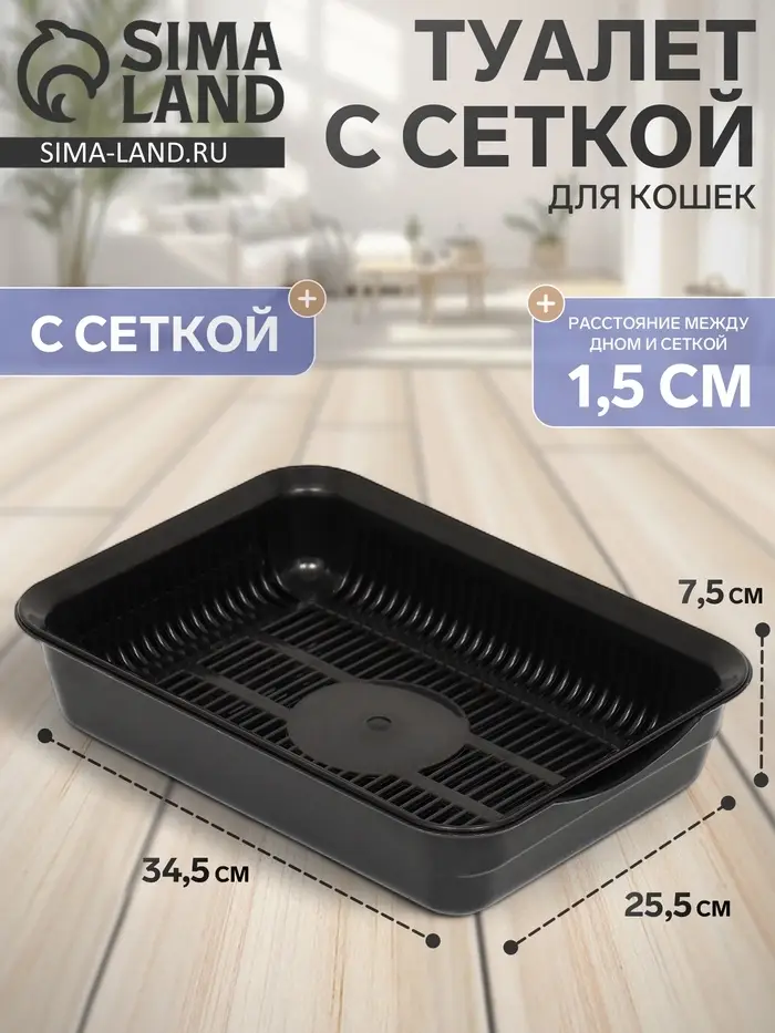 Туалет для кошек, 34.5×25.5×7.5 см, с сеткой, пластик, чёрный