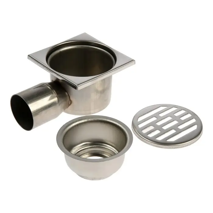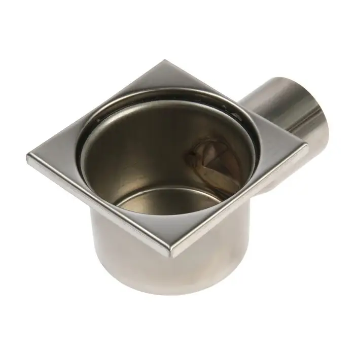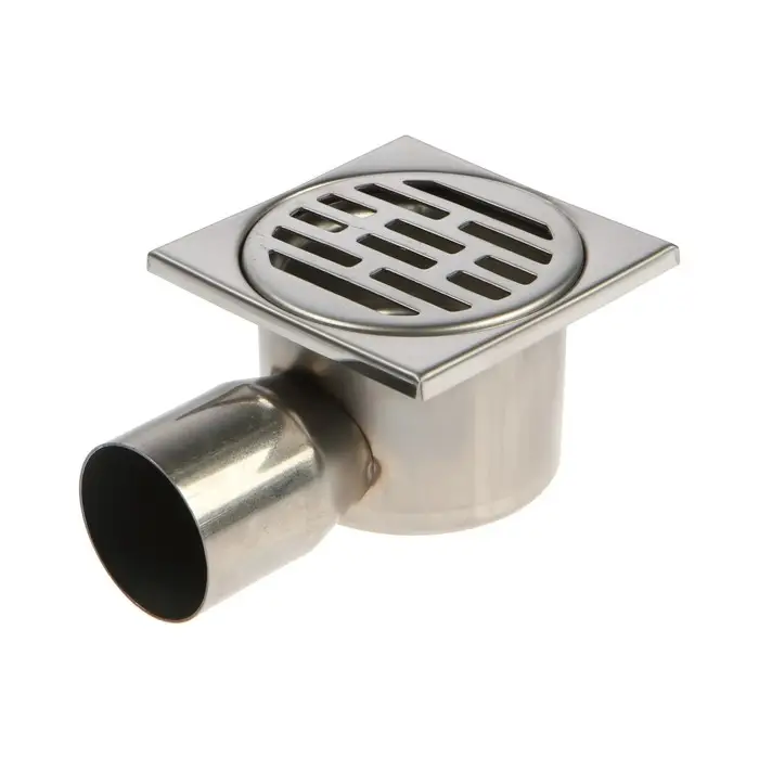 Душевой трап ZEIN квадратный 100×100 мм, горизонтальный с угловым выпуском — сифон для монтажа в стяжку с нестандартной разводкой. Конструкция позволяет подключиться под углом к основной трубе.