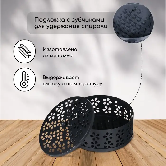 - Универсальность: подходит для использования как с антимоскитными спиралями, так и с ароматическими благовониями.
