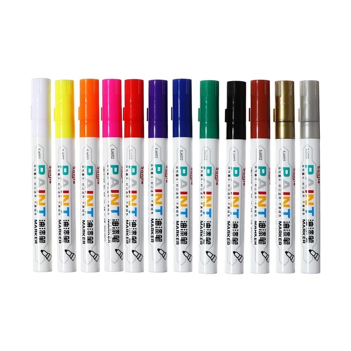Набор профессиональных лаковых маркеров на масляной основе, состоящий из 12 ярких цветов. Каждый маркер имеет водонепроницаемую и водостойкую формулу, что делает их идеальным инструментом для работы на улице и в промышленных условиях. Вы сможете без проблем наносить яркие и насыщенные рисунки на различные поверхности, включая стены, бумагу, дерево, керамику, пластик, металл, стекло, кожу, ткань и даже кроссовки.