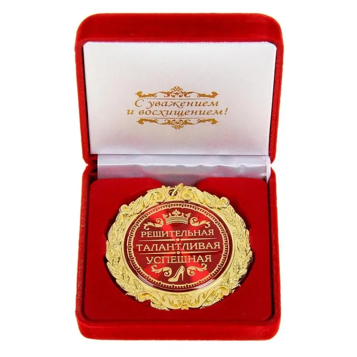 Создана формула идеального поздравления: классическая форма и праздничное содержание. Именно такой и является медаль в бархатной коробке «Решительная, талантливая, успешная», d=7 см. Это отличная награда для самых достойных представителей своего времени. Эксклюзивный сувенир станет достойным украшением вечера и поможет создать незабываемую церемонию поздравления.